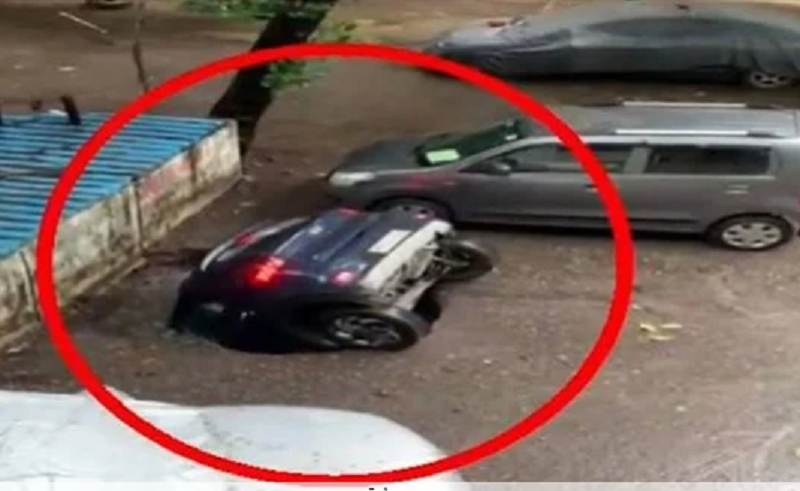 انتشر مقطع فيديو غريب على مواقع التواصل الاجتماعي للسيارة وهي تغرق داخل الحفرة الموجودة بأحد شوارع مومباي بالهند.