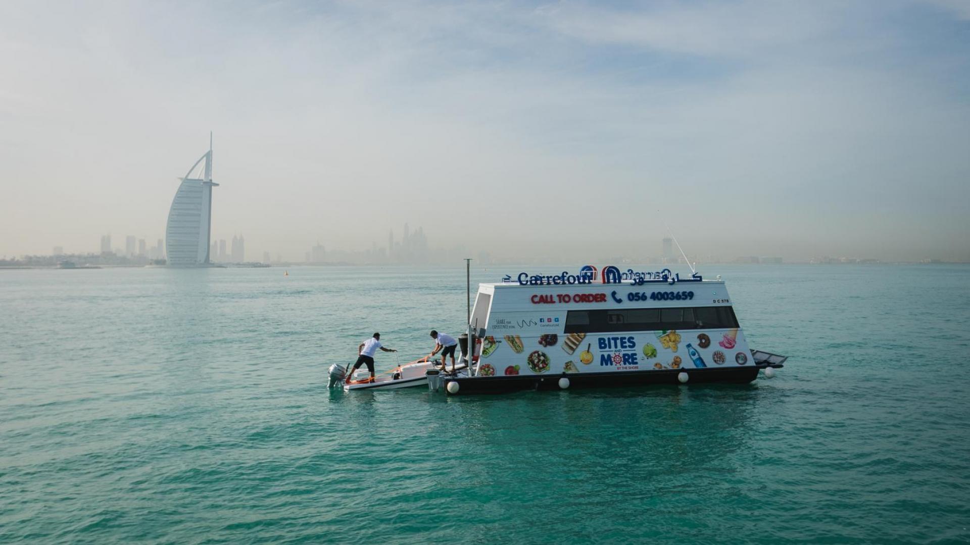 ويلبي المتجر العائم "Carrefour Bites and More by the Shore"، حاجات وطلبات السياح ورواد الرياضات البحرية (اليخوت والدراجات المائية)، حيث يقع على مقربة من منتجعات ثلاثة شواطئ هامة في المنطقة: كايت بيتش والجميرا والصفوح.