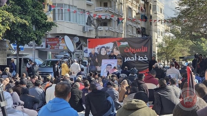 غزة: أدى المئات من الفلسطينيين صلاة الجمعة، اليوم، أمام مقر الصليب الأحمر في مدينة غزة، تضامنًا مع الأسيرات والأسرى في سجون الاحتلال.