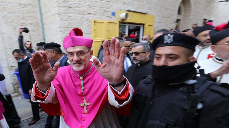 واستقبل البطريرك بيتسابالا الذي رافقه لفيف من المطارنة والأساقفة وكبار رجال البطريركية ووجهاء الرعية على بلاطة ساحة المهد من قبل المستقبلين حسب الستاتيكو المتبع.