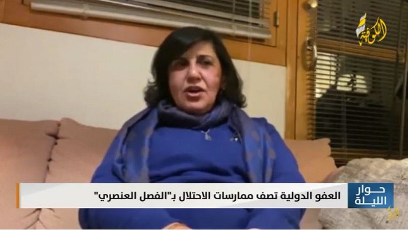 وقالت الناشطة ماضي، خلال لقائها على قناة "الكوفية" في برنامج "حوار الليلة"، أمس الأربعاء، إنه " لن يتم التوجيه إلى مجلس الأمن من خلال تقرير "العفو الدولية"، لأنه صادر عن جمعية".