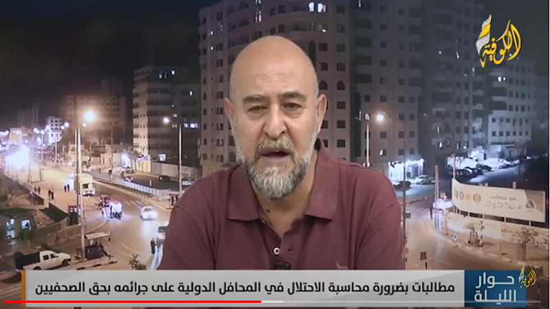 وأضاف، في برنامج "حوار الليلة" على قناة "الكوفية"، أن فلسطين تستحق أن تكون في الاتحاد الدولي للصحفيين، مطالبا بضرورة محاكمة الاحتلال على جرائمه المستمرة تجاه الصحفيين.