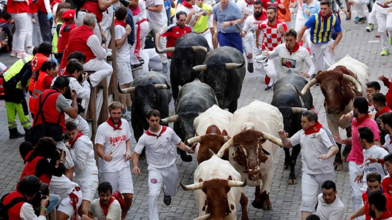 وينطلق مهرجان الركض مع الثيران يوم الخميس عندما يتدافع الآلاف من الباحثين عن الإثارة بجنون لتجنب ستة ثيران وهم يركضون على طول طريق متعرج مرصوف بالحصى إلى حلبة مصارعة الثيران في المدينة، ويتابع آخرون من الشرفات والحواجز الخشبية التي أقيمت على طول الطريق، بينما يخصص باقي اليوم للأكل والشرب والرقص والترفيه الثقافي.