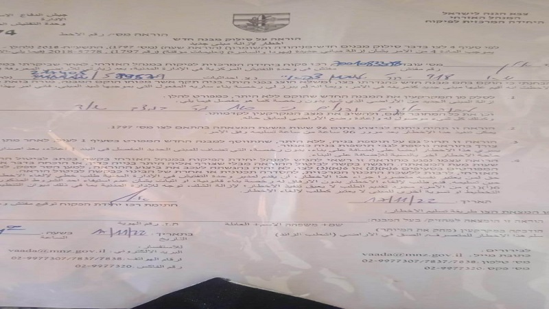 وقال منسق لجان الحماية والصمود بمسافر يطا، فؤاد العمور، في تصريح صحفي، إن "سلطات الاحتلال سلمت إخطاراً بهدم مدرسة قيد الإنشاء في تجمع الصفي بمسافر يطا بحجة البناء دون ترخيص".