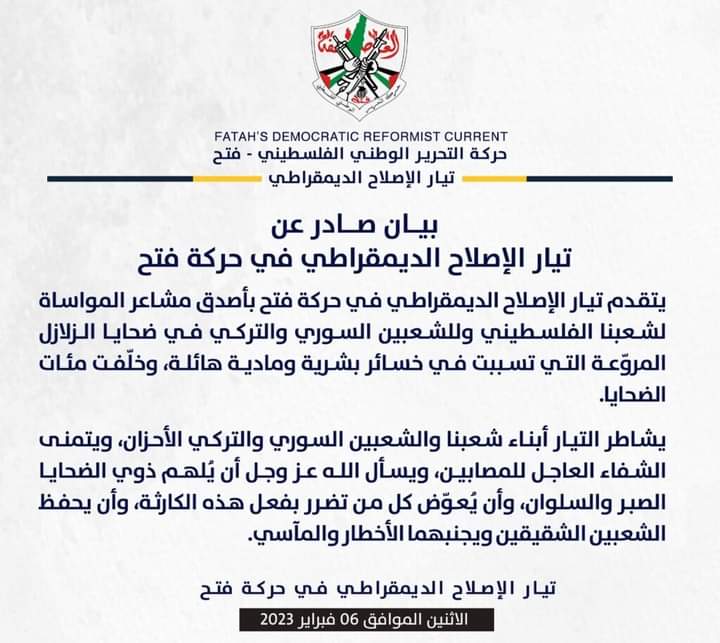 غزة: تقدم تيار الإصلاح الديمقراطي في حركة فتح، بأصدق مشاعر المواساة للشعب الفلسطيني، والشعبين السوري والتركي، في ضحايا الزلازل المروعة التي تسببت في خسائر بشرية ومادية هائلة، وخلفت مئات الضحايا.