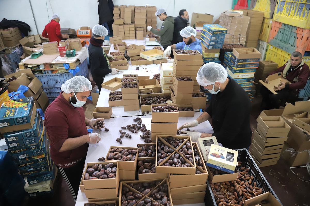 غزة: يقف عشرات العمال بانتظام داخل شركة لاستيراد التمور، لترتيب التمر المستورد داخل صناديق كرتونية، تجهيزاً لبيعه في الأسواق المحلية بقطاع غزة قبيل شهر رمضان.