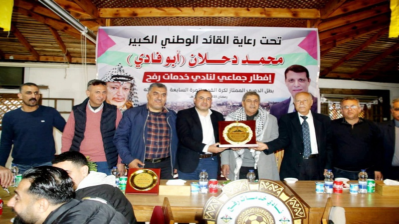 رفح: نظم تيار الإصلاح الديمقراطي في حركة فتح " مجلس الشباب" لجنة الأندية في ساحة غزة، وبرعاية كريمة من القائد محمد دحلان، اليوم الاثنين، إفطاراً جماعياً لنادي خدمات رفح الرياضي ممثلاً برئيس وأعضاء مجلس الإدارة والجهازين الفني والإداري واللاعبين، بمناسبة تتويجه بطلاً للدوري الممتاز لكرة القدم للمرة السابعة في تاريخه.
