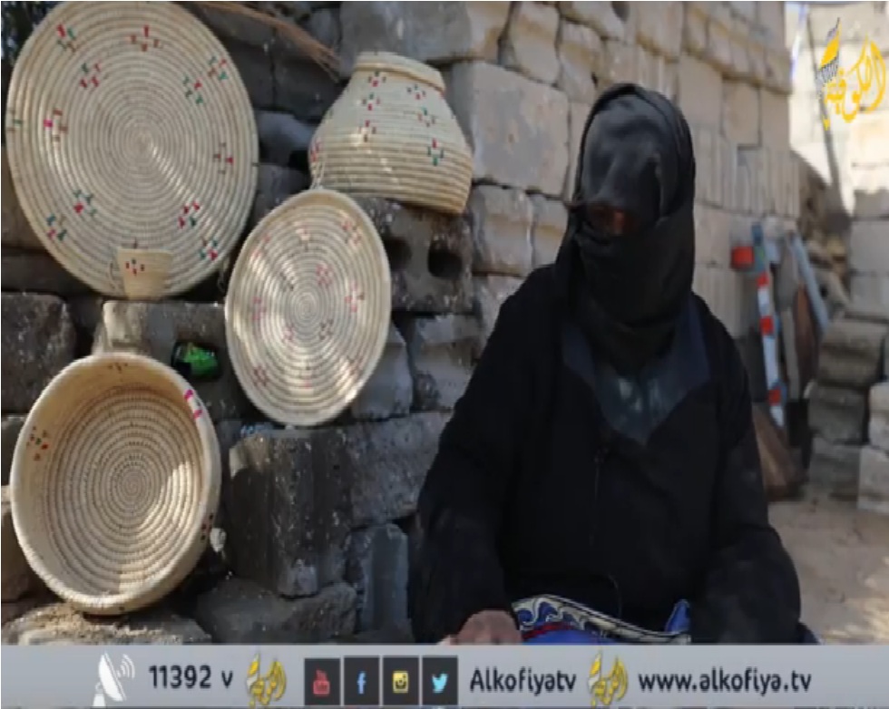 وسط ساحةِ منزلٍ قديم يروي ذكرياتٍ تعود لأكثر من 70 سنة، تجلس فاطمة اللحام (71عامًا) تمسك بيديها المجعدتين (الميبرا) وتبدأ في صناعة أواني من سعف أشجار النخيل المحيطة بمنزلها.