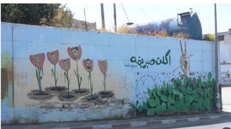 الكوفية -جنين: في لوحة فنية، رُسمت على جدار بمدينة جنين، يظهر نبات الصبار، وهو رمز لتحمّل الفلسطينيين لعذابات الاحتلال، وتتعالى فوقه الأسلاك الشائكة، وتنبعث من بين نبات الصبر، يد تشير بعلامة النصر بينما تحمل ملعقة، في إشارة للأداة التي استخدمها ستة أسرى قبل عامين في حفر نفق، نجحوا من خلال في الهرب من سجن جلبوع الإسرائيلي.