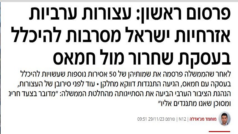 وذكرت القناة الـ12 العبرية، إن الأسرى الفلسطينيين من المواطنين العرب، المتوقع إطلاق سراحهم ضمن صفقة تبادل الأسرى مع حركة حماس، أعلنوا اليوم الأربعاء عبر محاميهم لدى وزارة العدل والنيابة العامة، رفضهم إدراجهم في الصفقة.