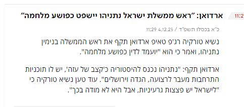 ترجمة خاصة للكوفية: هاجم الرئيس التركي رجب طيب أردوغان، رئيس حكومة الاحتلال بنيامين نتنياهو، قائلا إنه "سيحاكم باعتباره مجرم حرب"، بحسب ما ذكرته القناة السابعة العبرية.