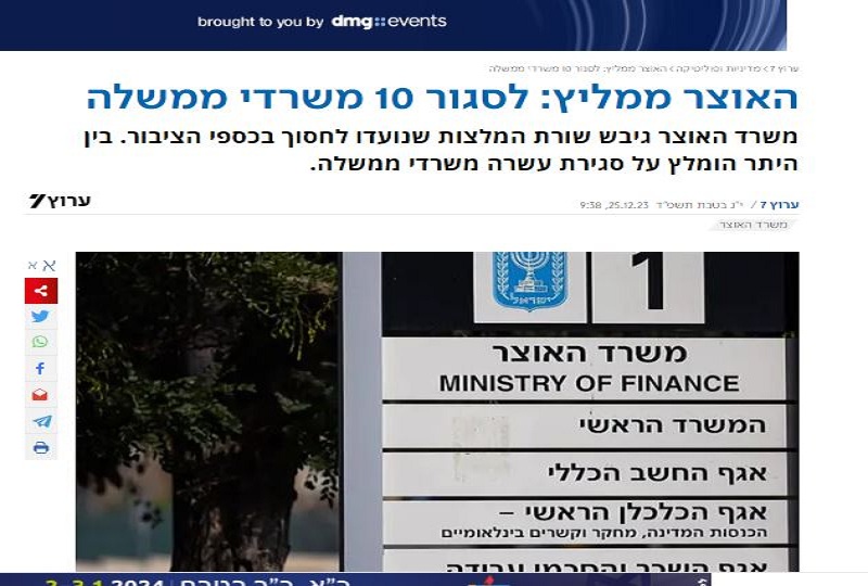 القناة السابعة العبرية: وزارة المالية توصي بغلق 10 وزارات ترشيدا للنفقات