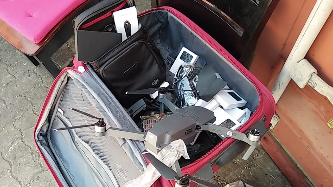 وأضافت المصادر، أنه بتفتيش الحقيبة تبين وجود طائرة مزودة بكاميرات فيديو محظور حيازتها طبقاً لأحكام قانون الاتصالات وتم احتجاز الطائرة.