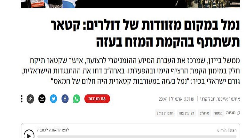 وبحسب مصدر إسرائيلي ، فإن المسؤولين في إسرائيل عندما علموا بذلك أعربوا عن معارضتهم لهذه الخطوة، لكن الأمريكيين لم يأخذوا في الاعتبار الموقف الإسرائيلي وأعلنوا أن قطر بالنسبة لهم جزء من المشروع.