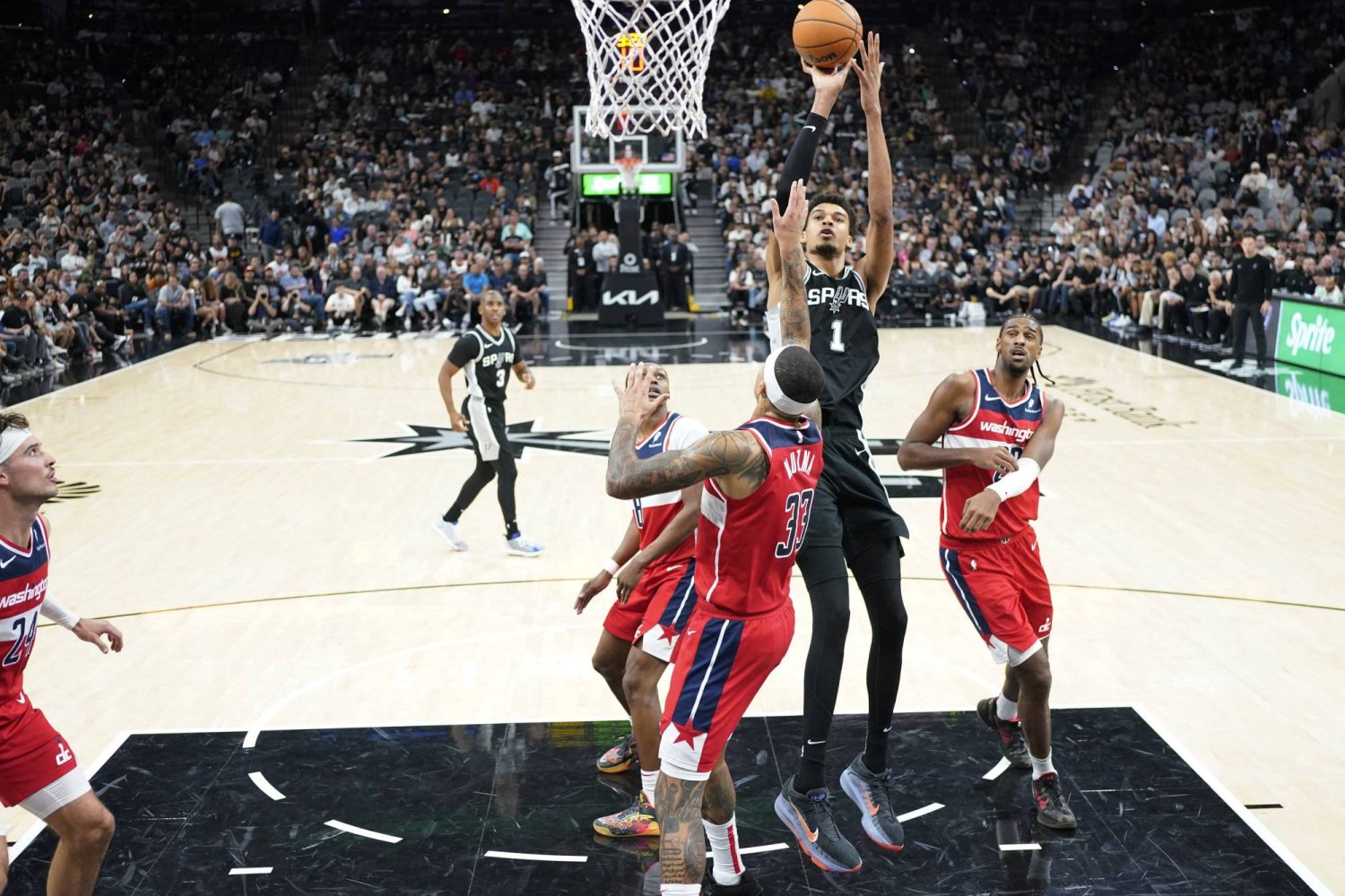 وكانت المباراة الثالثة توالياً التي يسجِّل فيها ويمبانياما 6 ثلاثيات أو أكثر (8 من 16 محاولة).