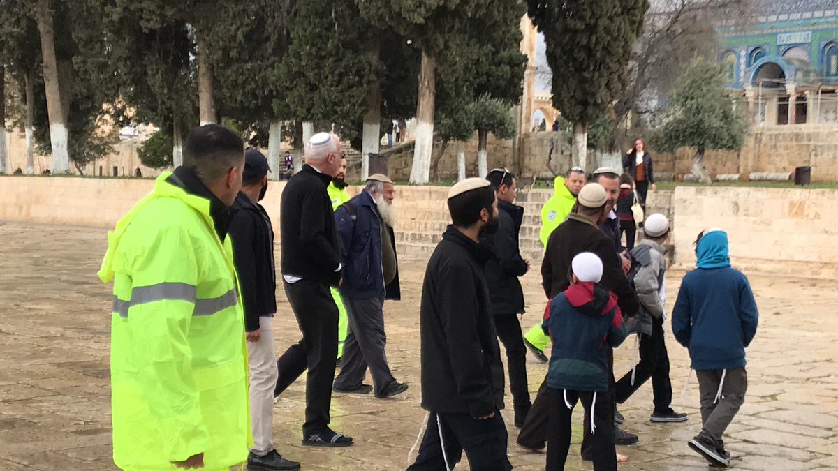 وأوضح فراس الدبس مسؤول العلاقات العامة والإعلام وزير الزراعة وأكثر من 170 متطرفا استباحوا المسجد الأقصى اليوم، على شكل مجموعات متتالية، عبر باب المغاربة بحراسة مشددة من قوات الاحتلال التي رافقت المجموعات خلال سيرها بساحات الأقصى بدءا من ساحة باب المغاربة ومرورا بساحة المسجد القبلي والمراوني وباب الرحمة وصولا الى منطقة باب القطانين، وخرجوا من باب السلسلة.