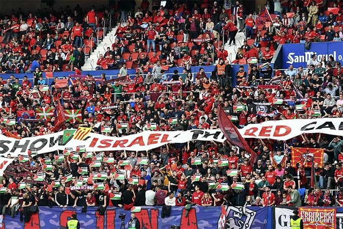 وحمل مشجعو أوساسونا لافتة كبيرة كُتب عليها: "أظهر لإسرائيل البطاقة الحمراء"، وهي عبارة تحمل طابعاً كروياً يعني طرد اللاعب، عند تلقيه بطاقة من هذا اللون، وهو ما يؤكد موقف جماهير الفريق الثابت من القضية الفلسطينية، إذ لم تكن هذه اللفتة هي الأولى من نوعها، بعدما سبقتها العديد من محاولات إعلاء الصوت، لمساندة قطاع غزة، خلال حرب الإبادة الأخيرة، والتي استمرّت ما يقرب 15 شهراً، عانى خلالها الفلسطينيون المجازر والتهجير والتدمير.