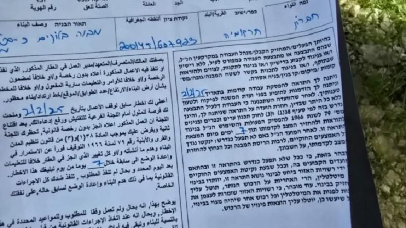 وأفادت مصادر محلية، بأن قوات الاحتلال سلّمت المواطنين إخطارات بوقف البناء في 3 مباني، إضافة لإخطار مبان أخرى بالهدم، بحجة عدم وجود ترخيص للبناء.
