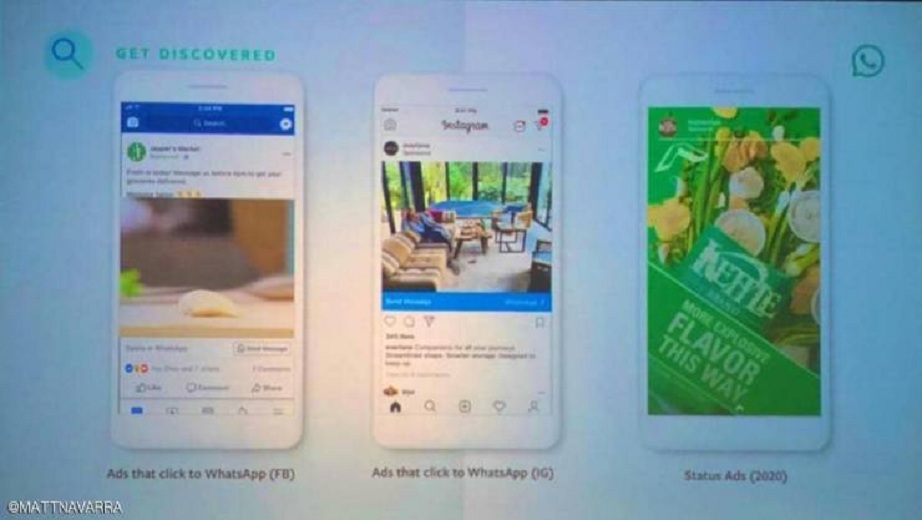 وقالت شركة فيسبوك إنها ستسمح بنشر إعلانات على تطبيق واتساب مطلع العام 2020، في محاولة للاستفادة من العدد الكبير من المشتركين في التطبيق للترويج للمنتجات والتسويق.
