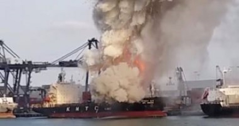 وقال مدير الميناء يوثانا موكاو لرويترز إن ألسنة اللهب وسحبا من الدخان الأسود تصاعدت من سفينة الحاويات الكورية الجنوبية “كيه.إم.تي.سي هونجكونج كو” خلال الصباح وحتى الظهر بالرصيف إيه2.