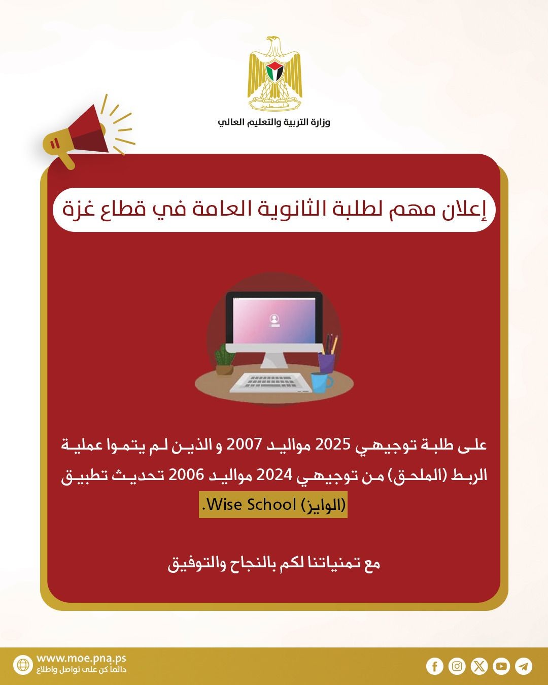 التربية والتعليم تصدر إعلانًا مهمًا لطلبة الثانوية العامة في قطاع غزة