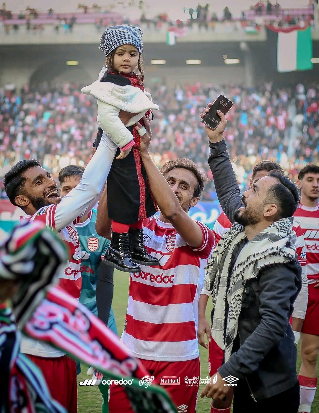 واحتفى لاعبو الفريقين، بالطفلة الناجية من الموت، والتي تم انتشالها من تحت الأنقاض في قطاع غزة خلال الحرب، قبل أن يتم نقلها إلى تونس لتلقي العلاج.