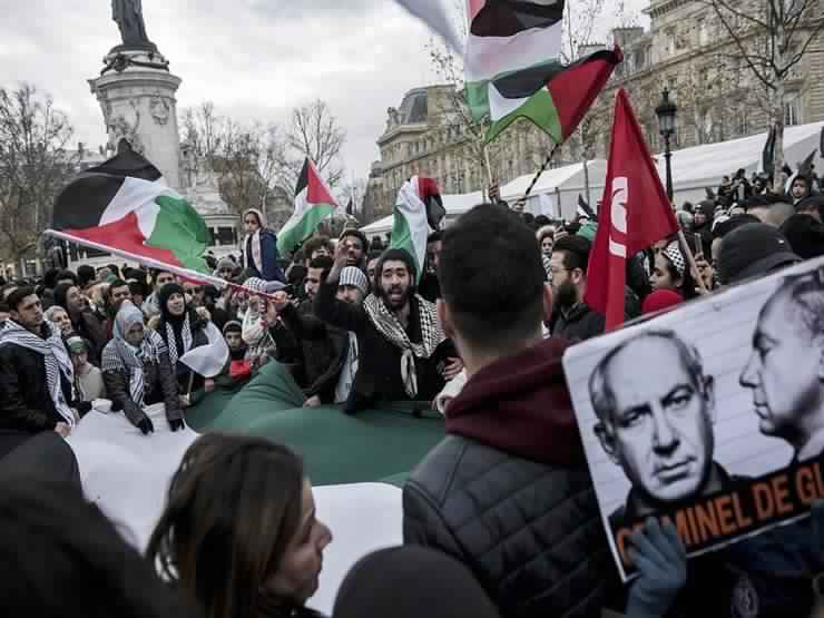 وردد المتظاهرون، ومن بينهم السناتورة البيئية اليسارية استير بنباسا، هتافات مناوئة لإسرائيل من بينها "إسرائيل مجرمة وماكرون متآمر" و"اوقفوا قتل الشعب الفلسطيني"، في حين أحاطت بهم قوات مكافحة الشغب التي منعتهم من عبور جسر الكسندر الثالث فوق نهر السين.