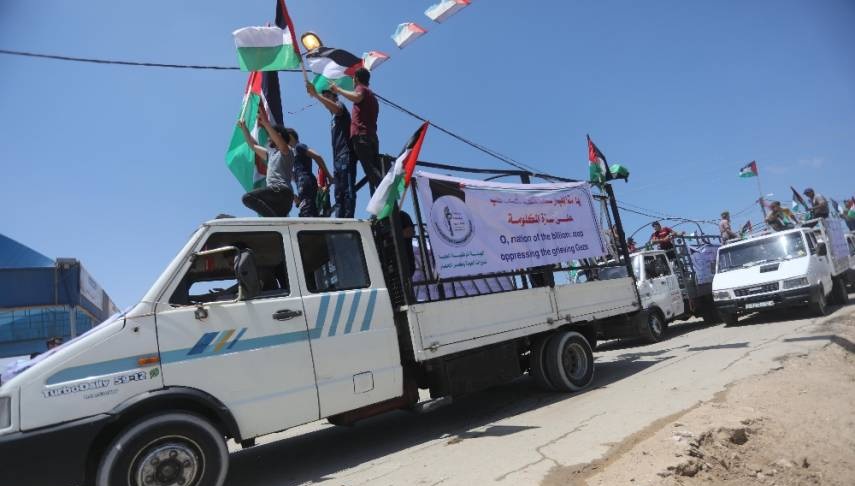 ووصلت عشرات الشاحنات إلى مخيم ملكة شرق غزة انطلاقا من مدخل بلدة بيت حانون شمال قطاع غزة للتنديد بالحصار المفروض على قطاع غزة.