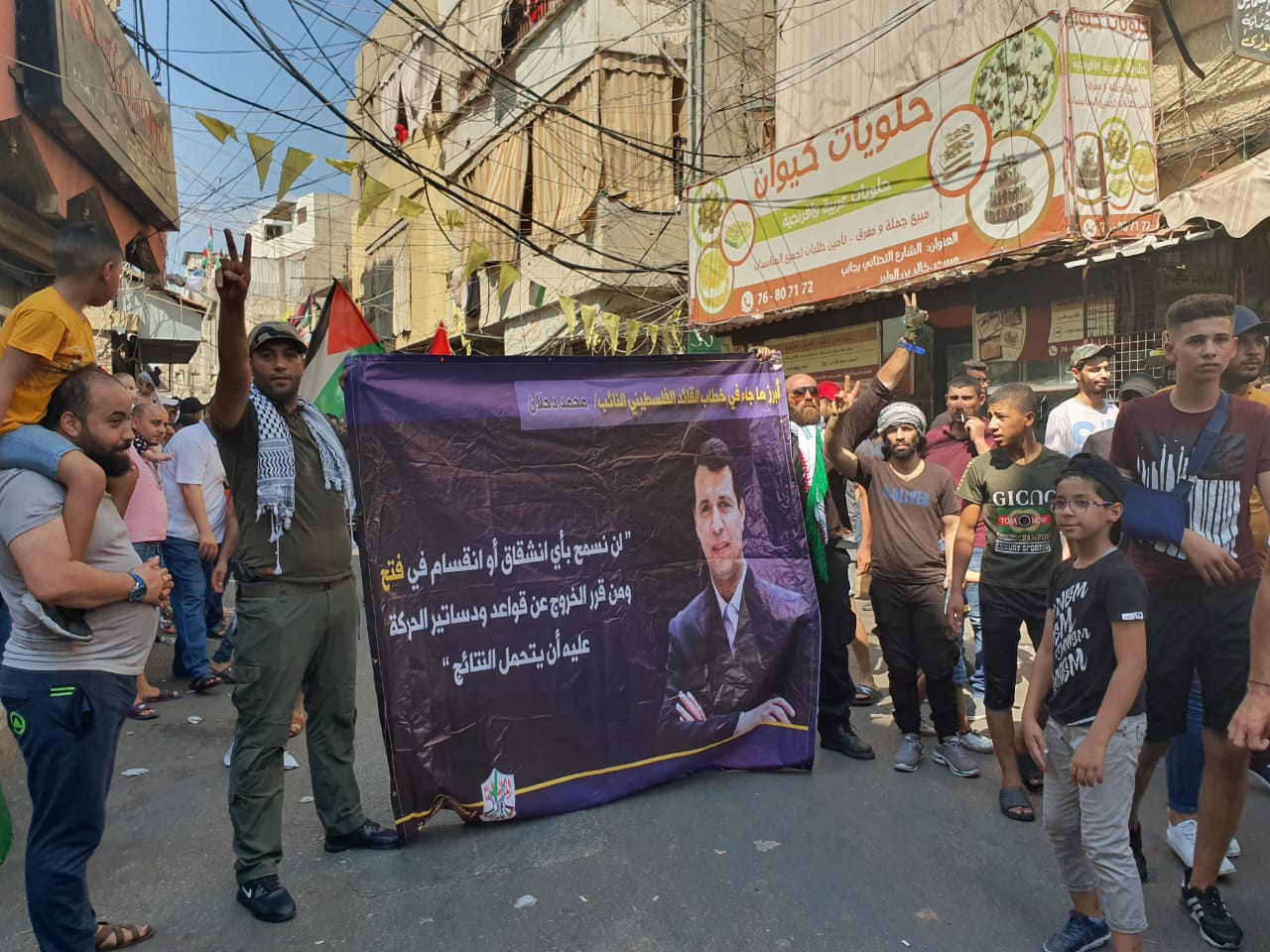 ورفع المتظاهرون، أعلام لبنان وفلسطين، وصورًا لقائد تيار الإصلاح الديمقراطي بحركة فتح النائب محمد دحلان، والشهيد أبو علي شاهين، ولافتات تطالب وزير العمل اللبناني بالتراجع عن قرارته.