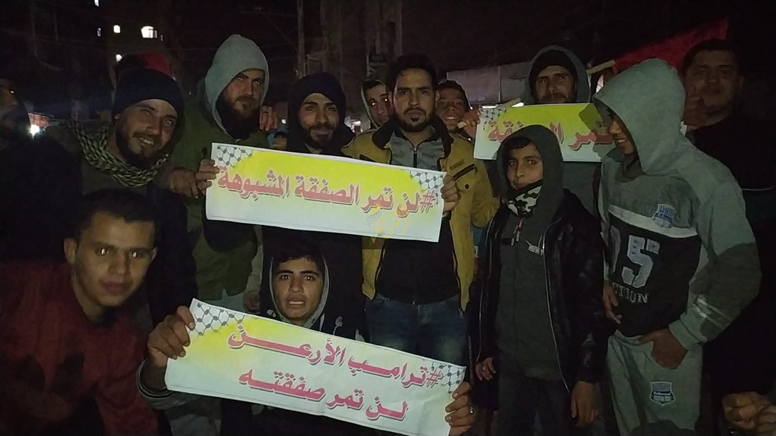 وندد المتظاهرين بالغضب الشديد لإعلان الصفقة بكل تبجح وعنجهية ذون مراعاة اهات الشعب الفلسطيني.