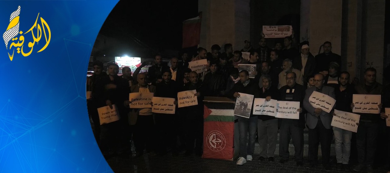 وشارك في الوقفة العشرات من كوادر الجبهتين الشعبية والديمقراطية، إلى جانب ممثلين عن الفصائل والقوى الوطنية والإسلامية بالمحافظة، رافعين الأعلام الفلسطينية ولافتات تحمل شعارات منددة بالقرار الأمريكي وتطالب المجتمع الدولي بضرورة الوقوف إلى جانب الشعب الفلسطينية لمواجهة تلك الصفقة.