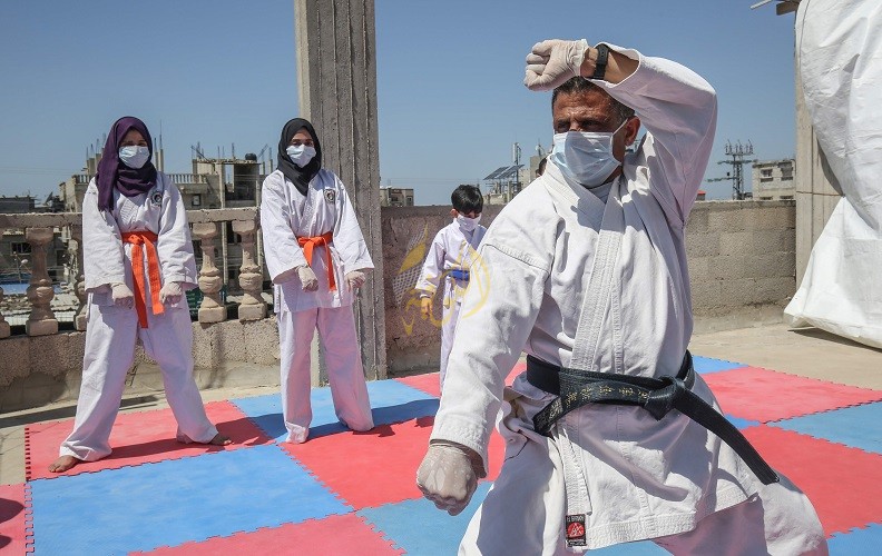 رفح: حوّل مدّرب الكاراتيه خالد شيخ العيد (51 عامًا)، من محافظة رفح جنوبي قطاع غزة سطح منزله إلى صالة تدريب لأبنائه الستة، وذلك بعد اضّطراره لإغلاق ناديه الخاص بالتدريب الكائن أسفل المنزل بسبب جائحة كورونا.