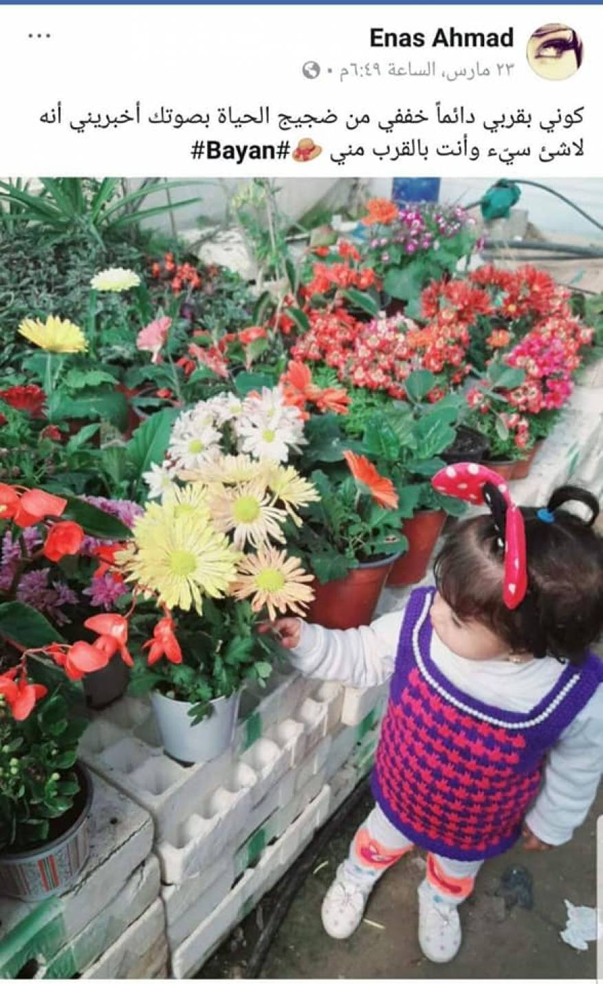 وكتبت الشهيد إيناس الكلمات لطفلتها على حسابها على فيس بوك، حيث قالت "كوني بقربي دائمًا خففي من ضجيج الحياة بصوتك أخبريني أنه لا شيء سيء وأنت بالقرب مني".