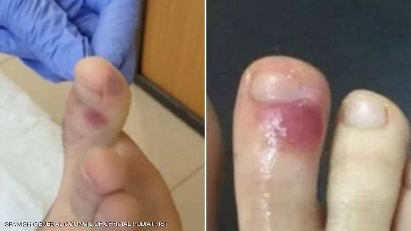 وأشارت وكالات عالمية نقلاً عن "تايمز أوف إنديا"، الى أنخ في البداية تبدو أصابع القدم متورمة وتتخذ لونًا أحمر، وفي بعض الأحيان يتورم جزء من إصبع القدم، ويمكن رؤية الآفات أو النتوءات الفردية، وبمرور الوقت تصبح الآفات أرجوانية اللون.