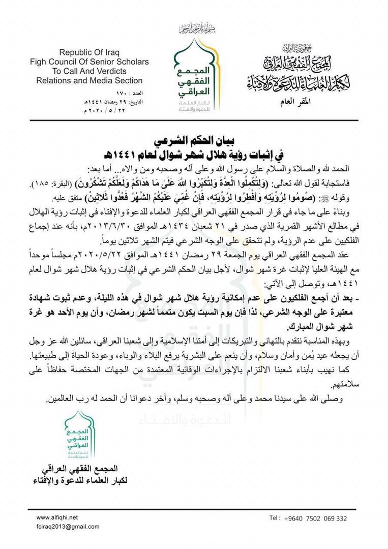 من جهته، أكد المجمع الفقهي العراقي لكبار علماء الدعوة والإفتاء "الوقف السني"، أن السبت مكمل لشهر رمضان وأن الأحد المقبل أول أيام شهر شوال.