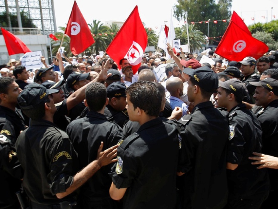 ومنعت الشرطة التونسية، المعتصمين من دخول بهو البرلمان قبل أن تفرض سياجا أمنيًا ووضع أسلاك شائكة في مجلس النواب.