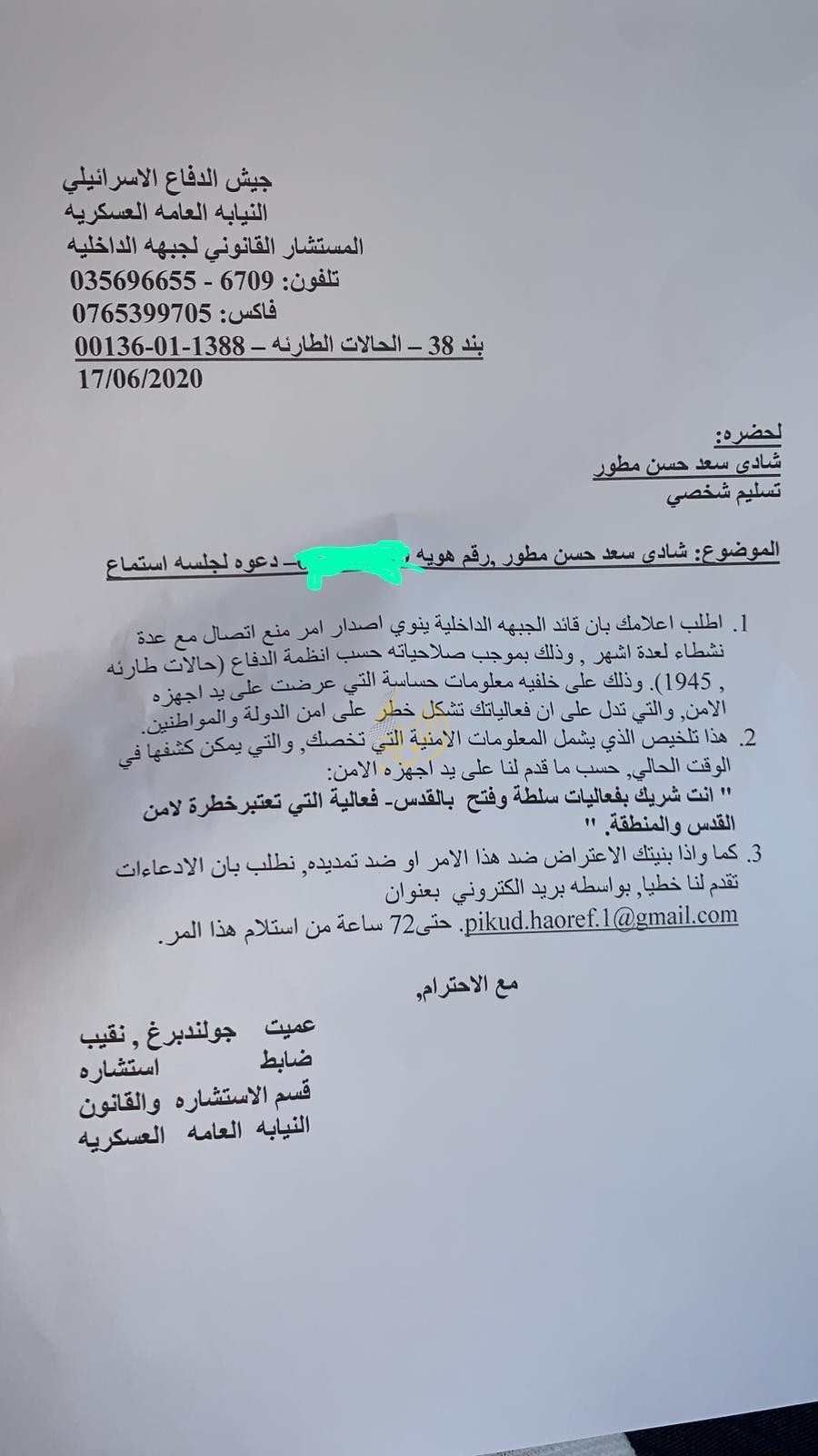 القدس المحتلة: سلمت مخابرات الاحتلال الإسرائيلي، مساء اليوم الخميس، أمين سر حركة فتح في مدينة القدس المحتلة شادي مطور، إخطارا بمنعه من التواصل مع عدد من النشطاء.