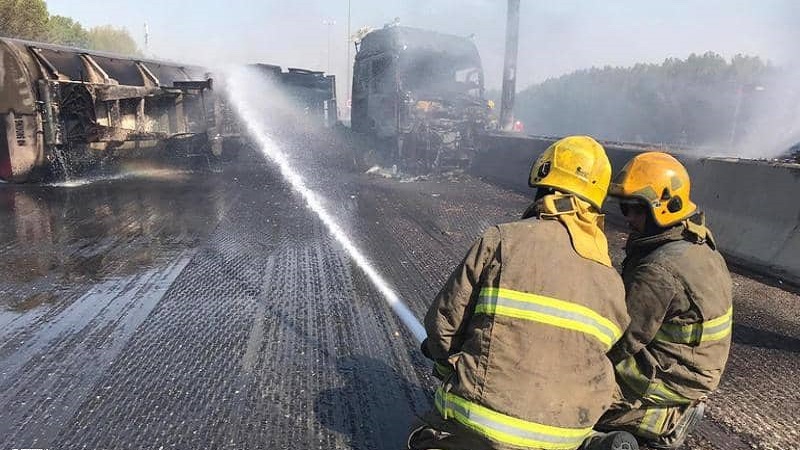 وذكرت الإدارة، أن الحريق اندلع عقب انقلاب خزان لنقل وقود الدیزل، بحمولة 36 ألف لتر، حيث توجهت فرق الإطفاء من مراكز مختلفة إلى موقع الحادث، وتمكنت من السیطرة على الحريق بسرعة قیاسیة رغم انتشار ألسنة اللھب التي طالت مركبتین وأشجارا على جانب الطریق.