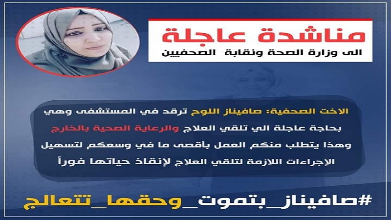 Image may contain: ‎2 people, ‎text that says '‎مناشدة عاجلة الى وزارة الصحة ونقابة الصحفيين الاخت الصحفية: صافيناز اللوح ترقد في المستشفى وهي بحاجة عاجلة الي تلقي العلاج والرعاية الصحية بالخارج وهذا يتطلب منكم العمل بأقصى ما في وسعكم لتسهيل الإجراءات اللازمة لتلقي العلاج لإنقاذ حياتها فوراً تتعالج #صافيناز بتموت_‎'‎‎