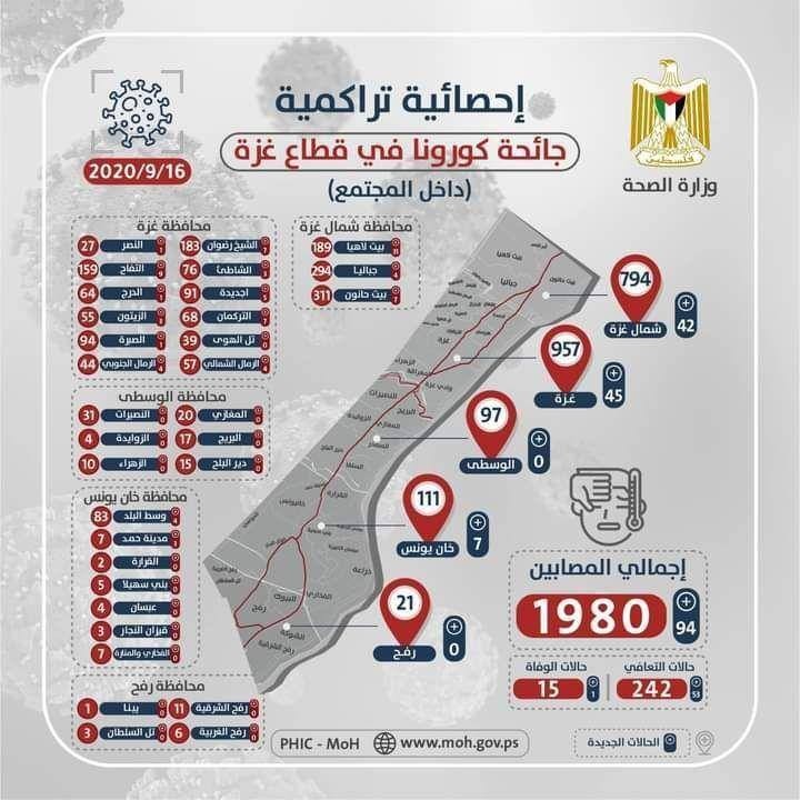 غزة: نشرت وزارة الصحة في غزة، اليوم الأربعاء، 16 سبتمبر/ أيلول 2020 الخارطة الوبائية لمصابي فيروس كورونا في محافظات القطاع.