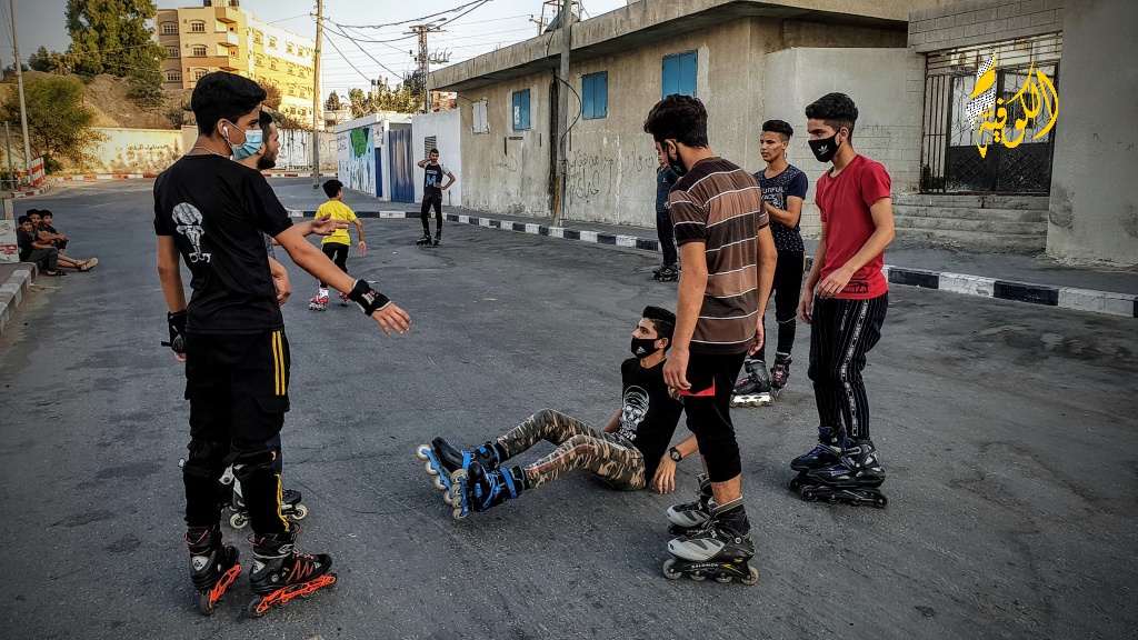 غزة – عمرو طبش: يتجول لاعبو فريق "سكيت فلسطين" في شوارع مدينة خانيونس، مستعرضين موهبتهم في التزلج.