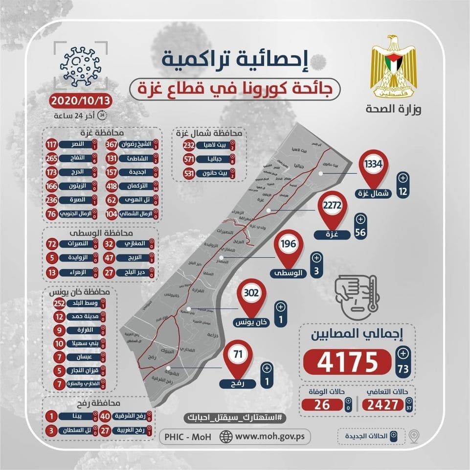 غزة: نشرت صحة غزة، ظهر اليوم الثلاثاء، الخارطة الوبائية لمصابي فيروس كورونا في محافظات القطاع.