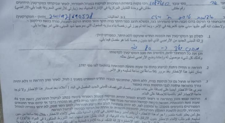وأوضحت مصادر محلية، بأن الاحتلال أخطر بوقف البناء في أربع غرف زراعية في منطقة "ظهر الرياح" تعود للمواطنين، "رزق شحادة صلاح، ومحمد شحادة صلاح، ومأمون نصري صلاح ، وصلاح شحادة صلاح"، بحجة عدم الترخيص .