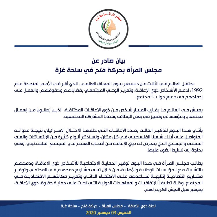 وأصدر المجلس بيان في مناسبة يوم المعاق العالمي، قال فيه "إن في العالم يعيش ما يقارب المليار شخص من ذوي الاعاقات المختلفة، الذين يُعانون من إهمال مجتمعي ومؤسساتي وتمييز في بعض الوظائف وقضايا المشاركة المجتمعية".