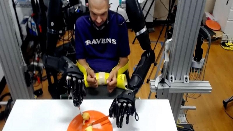 تعرض الشخص المشلول لحادث منذ 30 عاماً،  أفقده الحركة بأطرافه، وفي عام 2019 أجريت له عملية جراحية في مستشفى "جونز هوبكنز "في الولايات المتحدة، تم فيها زرع ستة أقطاب كهربائية في دماغه للتحكم في زوج من الأذرع الآلية.