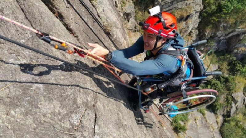 وبعد الحادث الذي تعرض له، استأنف التسلق مع ربط كرسيه المتحرك بنظام يعمل بمجموعة بكرات.