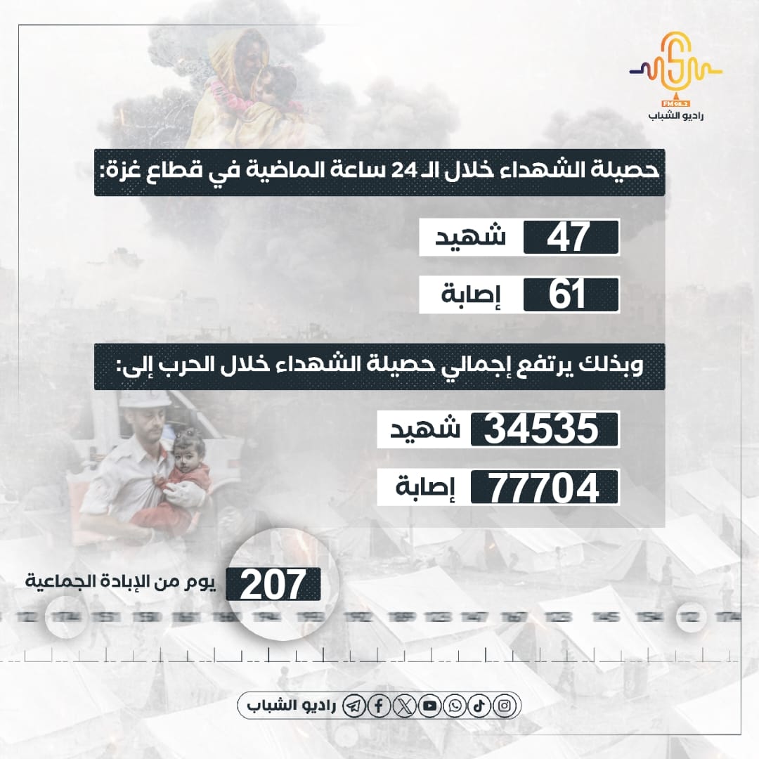 وذكرت "الصحة"، في التقرير الإحصائي اليومي لعدد الشهداء والجرحى جراء العدوان "الإسرائيلي" المستمر لليوم الـ 207 ، أن الاحتلال ارتكب 5 مجازر ضد العائلات في القطاع خلال الـ 24 ساعة الماضية، وصل منها للمستشفيات 47 شهيدا و 61 إصابة.