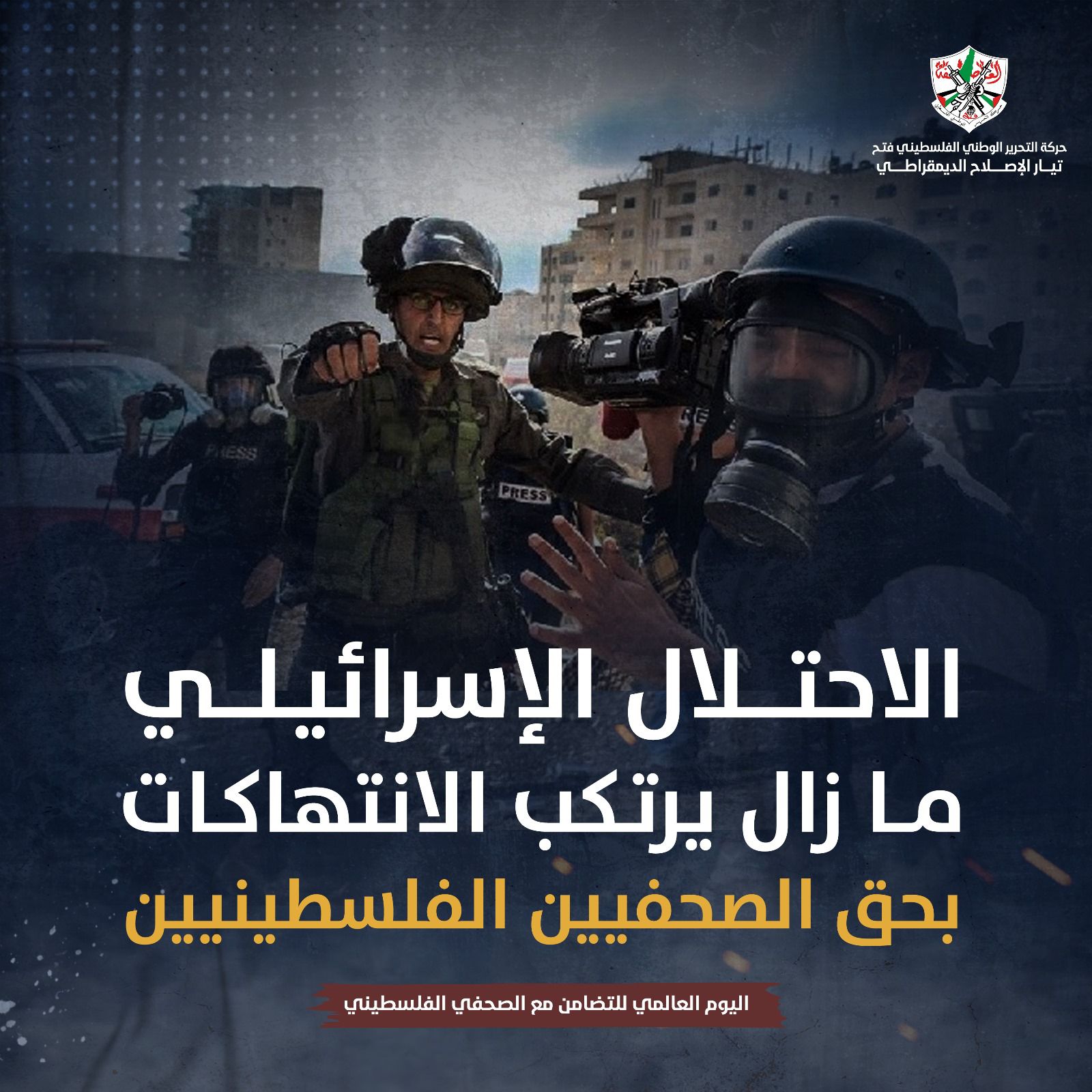 الكوفية قال المكتب الحركي المركزي للصحفيين بتيار الإصلاح الديمقراطي في حركة فتح إنه في اليوم العالمي لحرية الصحافة، الذي يُصادف الثالث من مايو، نتوجه بتحية إجلال وإكبار لكل صحفي وصحفية، حَمل روحه على كفه، في تغطية حرب الإبادة الجماعية التي تشنها اسرائيل على أبناء شعبنا الفلسطيني.