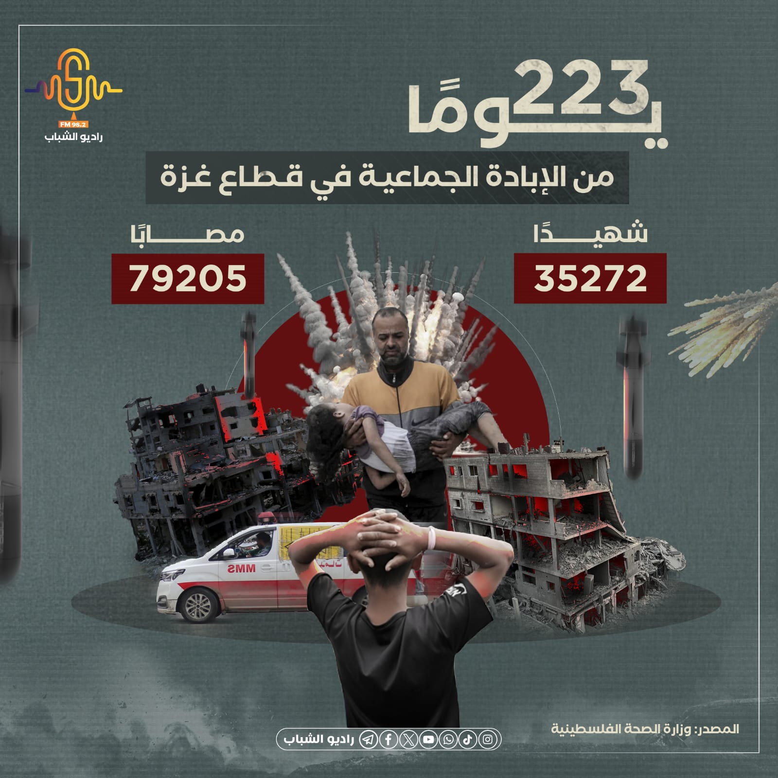 وذكرت أن حصيلة العدوان الإسرائيلي على قطاع غزة قد ارتفعت إلى 35 ألفًا و233 شهيدًا، إضافة لـ 79 ألفًا و141 مصابًا بجراح متفاوتة؛ منذ الـ 7 من أكتوبر 2023 الماضي.