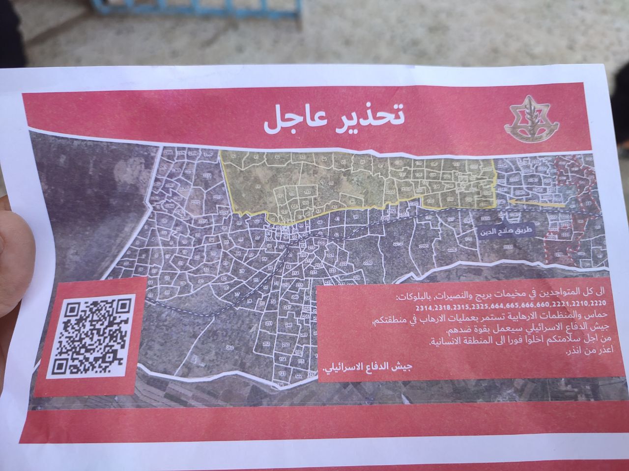 الكوفية أصدر الجيش الإسرائيلي، السبت، أوامر إخلاء جديدة، طالت مناطق واسعة في مخيمي النصيرات والبريج وسط قطاع غزة.
